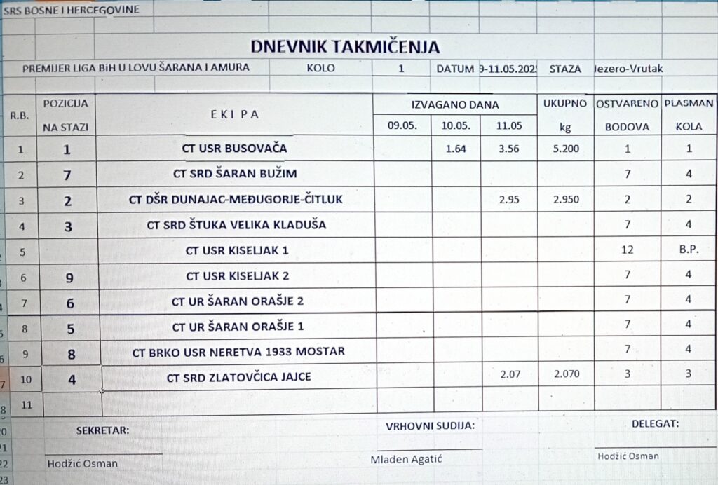 Od 09-11.05.2025. godine, na jezeru Vrutak, održano je 1. kolo Premijer lige BiH u lovu šarana i amura.